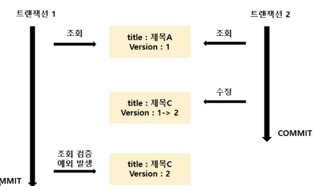 엔티티를 수정할 때 마다 버전이 하나씩 자동 증가하는데, 수정할 때 조회 시점의 버전과 다르면 예외 발생