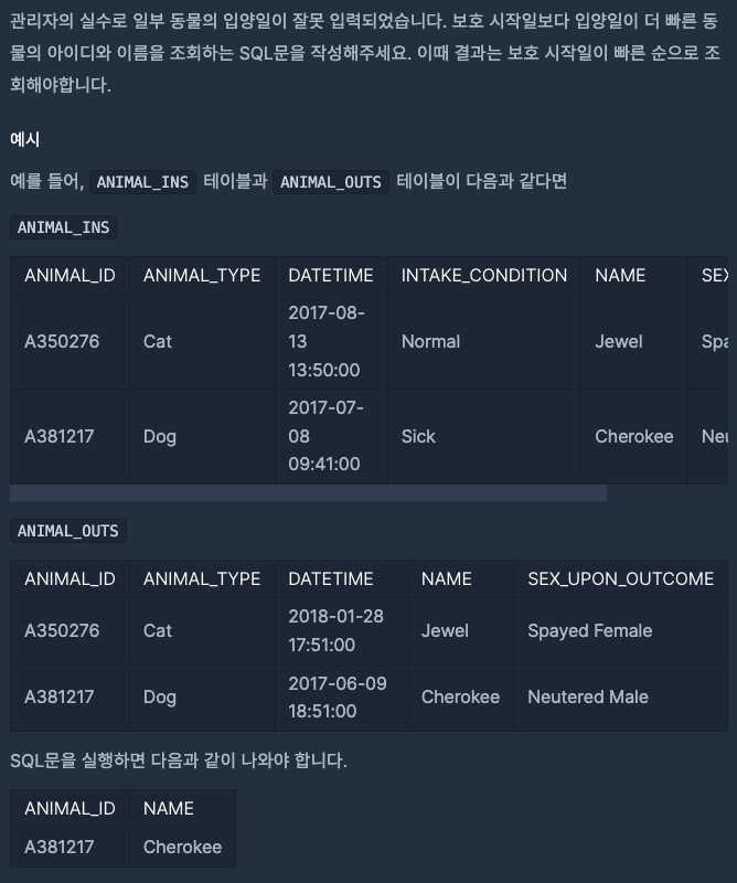 있었는데요 없었습니다 문제 정리하자면, 보호 시작일이 빠른 순으로 보호 시작일보다 입양일이 더 빠른 동물의 아이디와 이름을 조회하는 SQL문 작성하기