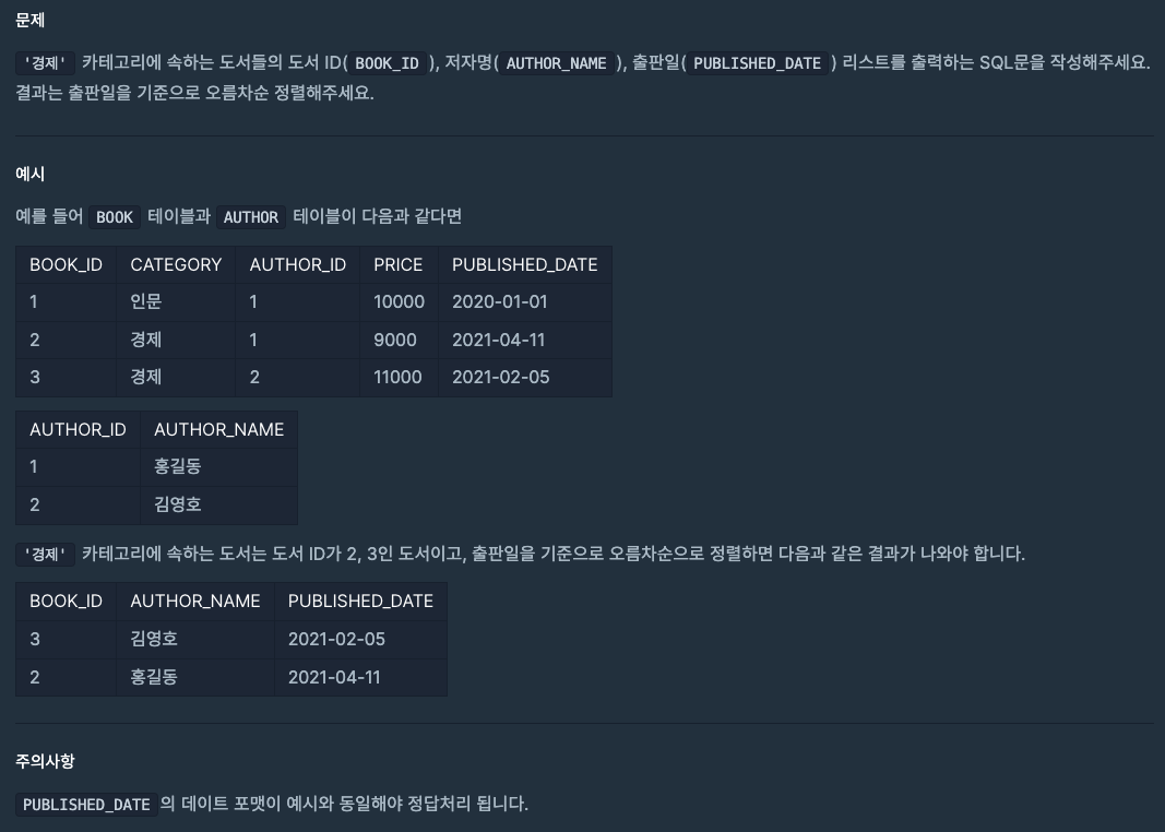조건에 맞는 도서와 저자 리스트 출력하기 문제를 정리하면, 경제라는 카테고리에서 데이트 포맷을 정리해서 출판일을 기준으로 오름차순 정렬해주기