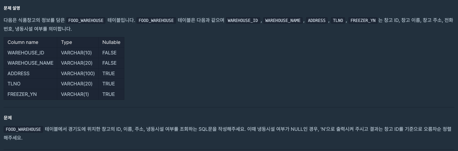 SELECT WAREHOUSE_ID, WAREHOUSE_NAME, ADDRESS, if(FREEZER_YN is null, 'N',FREEZER_YN) from FOOD_WAREHOUSE where ADDRESS like '경기도%' order by WAREHOUSE_ID;'SQL-프로그래머스' 카테고리의 다른 글