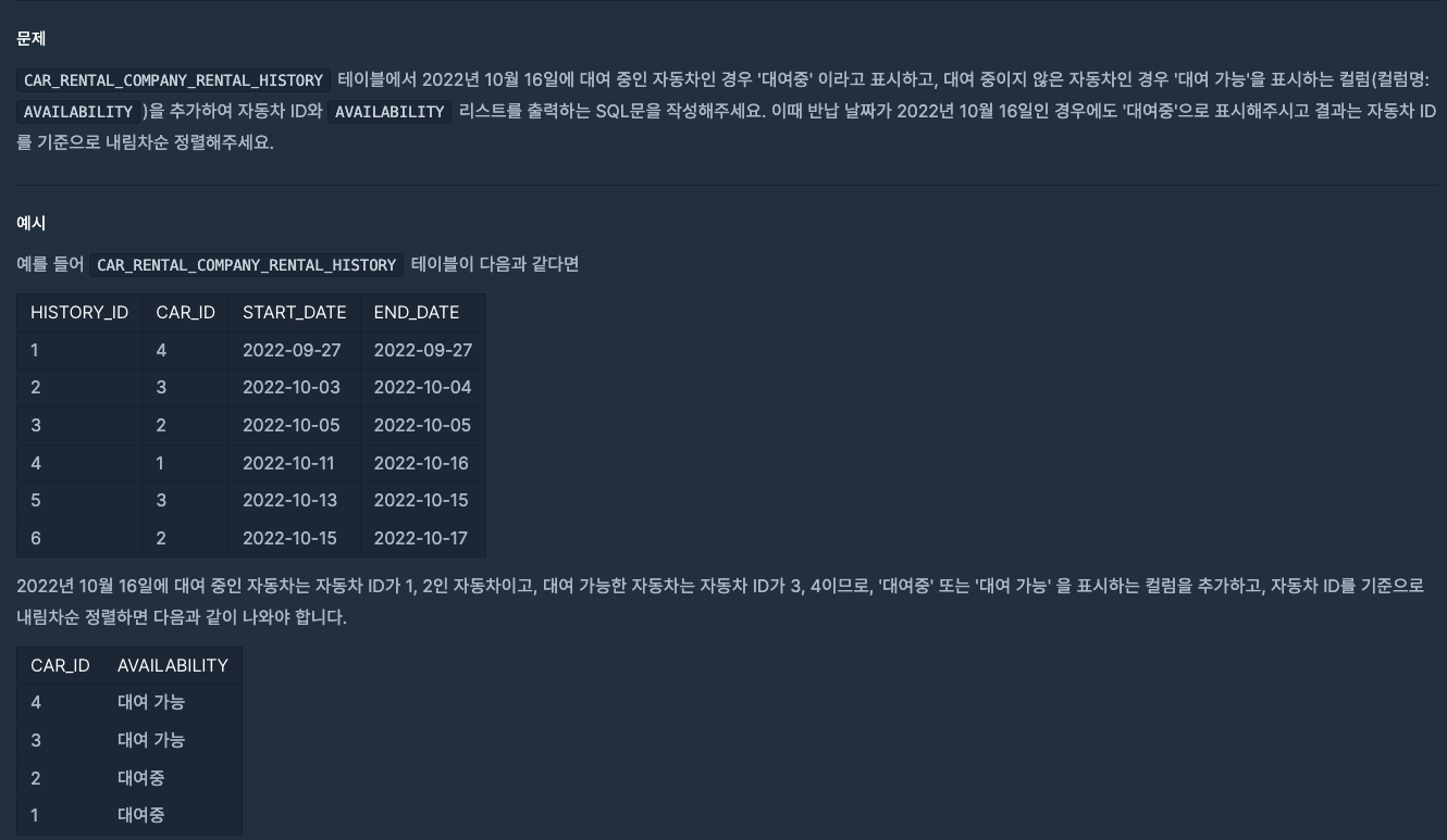 자동차 대여 기록에서 대여중 / 대여 가능 여부 구분하기 문제를 정리하면, 2022-10-16에 대여 중인 자동차는 '대여중' , 반납 날짜가 2022-10-16 여도 '대여중', 나머지는 '대여 가능'으로 출력하기