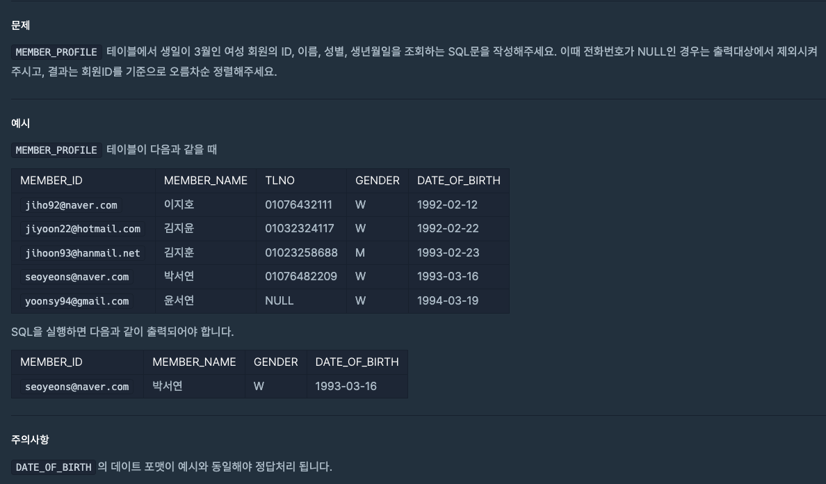 3월에 태어난 여성 회원 목록 출력하기 문제를 정리하면, 데이트 포맷을 주의해서 TLNO is not null & gender = 'W' & 생일이 3월인 회원의 ID, 이름, 성별, 생년월일을 조회하는 SQL문을 작성하기