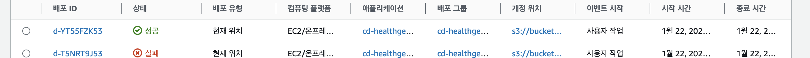 다른 블로그를 따라하면서 EC2, S3, Code deploy를 하는 중에 아래 사진들과 같이 action은 성공을 하는데, 계속 code deploy 배포중에 오류가 생겼다.