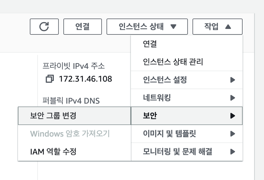 적용 해당 Ec2 인스턴스에 접근한 다음에 "작업 > 보안 > IAM 역할 수정"을 누른다음에 5번에서 지정한 이름을 선택해서 저장하면 cloudwatch에 데이터 보낼 권한이 추가 된것이다.