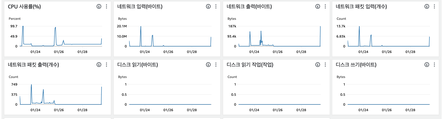cpu 사용량 cpu의 사용량이 99% 찍은 날 ec2가 다운되는 상황을 마주했었는데, 해당 ec2 로그들을 찍어보고 해결하기 위해서 우리는 aws의 cloud watch를 사용해보기로 결정했다.