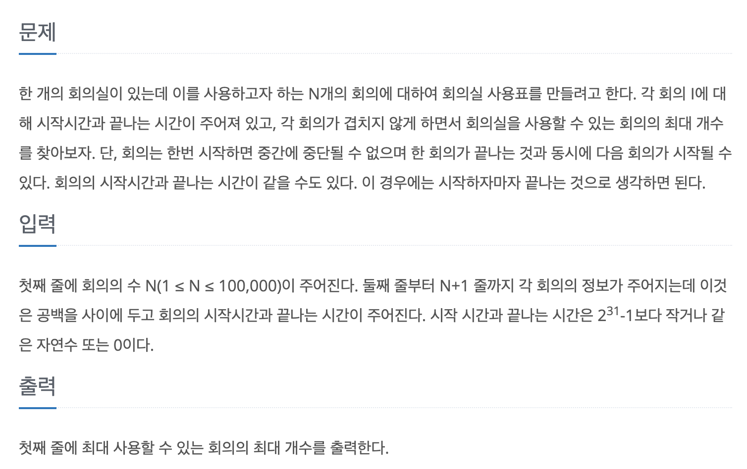 n = int(input()) time = [] for _ in range(n): s, e = map(int, input().split()) time.append([s, e]) # 시작 시간 -> 끝시간 순차적으로 오름차순을 해준다. ( 끝시간이 같아도 시작시간으로 오름차순이 된다 ) time = sorted(time, key=lambda a: a[0]) time = sorted(time, key=lambda a: a[1]) lastMeeting = 0 count = 0 for i, j in time: if i >= lastMeeting: count += 1 lastMeeting = j print(count)'알고리즘' 카테고리의 다른 글
