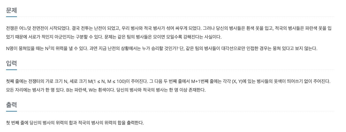 # 전쟁 - 전투 -> Dfs m, n = map(int, input().split()) board = [] for i in range(n): board.append(list(map(str, input()))) wCount = 0 wTotal = 0 bCount = 0 bTotal = 0 def dfs(x, y): global wCount if 0 <= x < n and 0 <= y < m and board[x][y] == 'W': board[x][y] = 'S' wCount += 1 dfs(x-1, y) dfs(x+1, y) dfs(x, y-1) dfs(x, y+1) return True return False def dfsS(x, y): global bCount if 0 <= x < n and 0 <= y < m and board[x][y] == 'B': board[x][y] = 'S' bCount += 1 dfsS(x-1, y) dfsS(x+1, y) dfsS(x, y-1) dfsS(x, y+1) return True return False for i in range(n): for j in range(m): if dfs(i, j) == True: wTotal += wCount ** 2 wCount = 0 for i in range(n): for j in range(m): if dfsS(i, j) == True: bTotal += bCount ** 2 bCount = 0 print(wTotal, bTotal)'알고리즘' 카테고리의 다른 글
