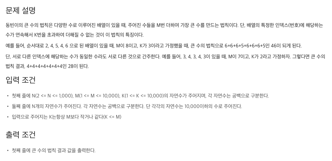 # 큰 수의 법칙 import sys input = sys.stdin.readline n, m, k = map(int, input().split()) data = list(map(int, input().split())) data = sorted(data, reverse=True) count = 0 ans = 0 # 가장 큰수가 2개일때 -> m * 큰수 if data[0] == data[1]: ans += m * data[0] # 가장 큰수가 1개일때 -> while ( k * 큰수 + 2번째 큰수 <= m ) if data[0] != data[1]: while m > 0: ans += data[0] m -= 1 count += 1 if count == k: ans += data[1] m -= 1 count = 0 print(ans)이코테 풀이