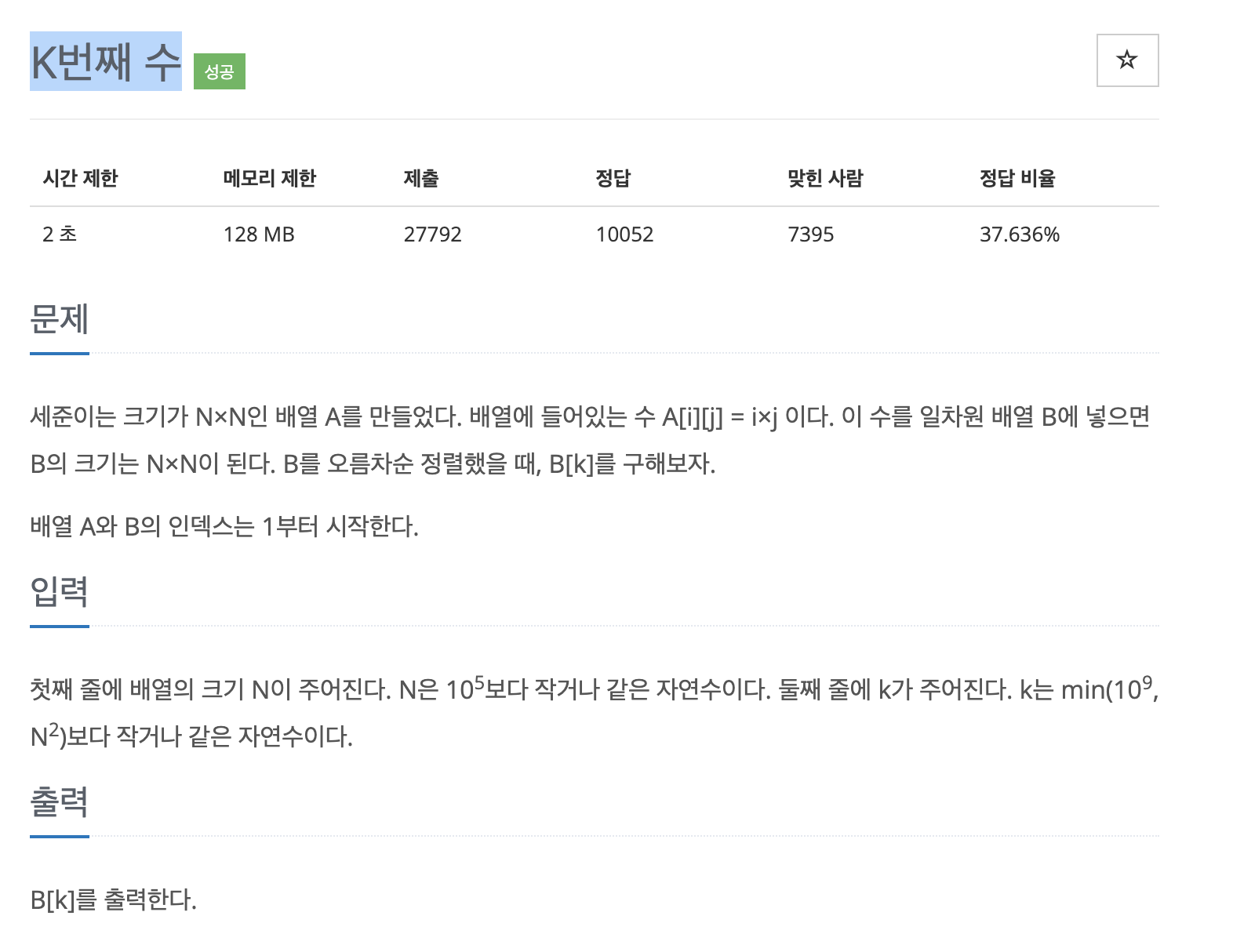 import sys input = sys.stdin.readline n = int(input()) k = int(input()) a = [[1] * n for _ in range(n)] for i in range(n): for j in range(n): a[i][j] = (i+1)*(j+1) b = sum(a, []) b.sort() print(b[k])처음 메모리 초과 나온 코드