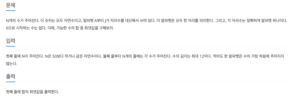 n = int(input()) arr = [[0, 'A'], [0, 'B'], [0, 'C'], [0, 'D'], [0, 'E'], [0, 'F'], [0, 'G'], [0, 'H'], [0, 'I'], [0, 'J']] first = [0 for _ in range(10)] for i in range(n): word = input() size = len(word) for j in range(size): idx = ord(word[size-j-1]) - 65 # 65는 ord('A') 값 => word를 순차적으로 해서 idx를 구한다 if j == size - 1: first[idx] = 1 arr[idx][0] += 10**j # 계수를 구해서 더해준다 arr.sort(reverse=True) #내림차순 if arr[9][0] != 0: # 내림차순 정렬된 배열의 마지막 원소의 값이 0이 아니라면 모든 알파벳 사용한것 for i in range(9, -1, -1): # 거꾸로 구해간다 if first[ord(arr[i][1]) - 65] == 0: # first에 들어있는지 체크 temp = list(arr[i]) arr.remove(temp) arr.append(temp) break res = 0 for i in range(10): res += arr[i][0] * (9-i) # 계수 * (9-i) print(res)'알고리즘' 카테고리의 다른 글